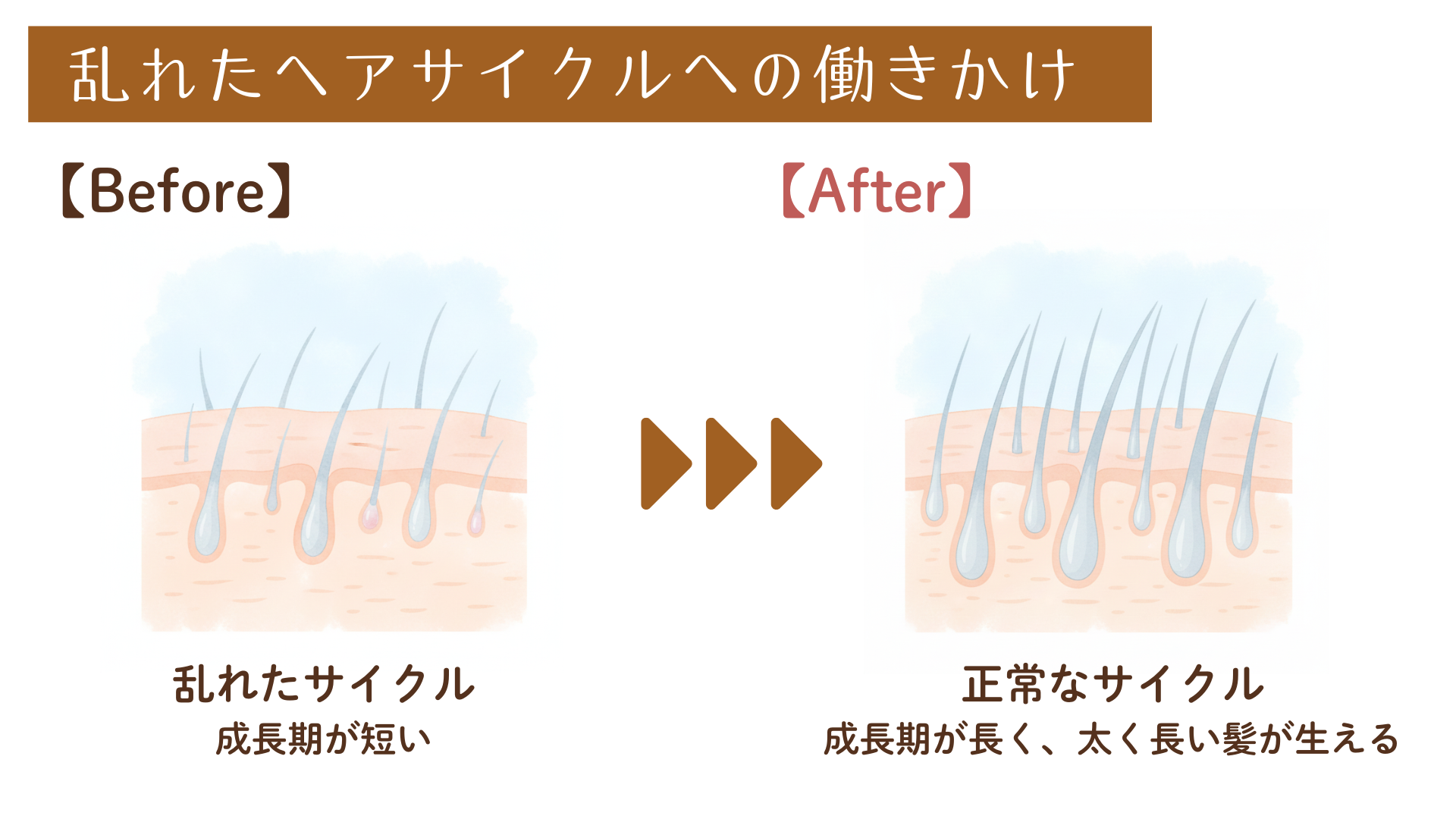 乱れたヘアサイクルを正常に導き、今ある髪の毛をしっかり残して、より太く長く育てるよう働きかけます。